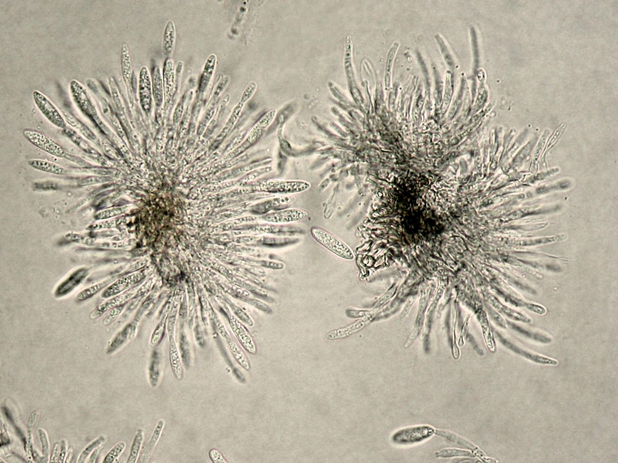: Deux acervules de Colletotrichum acutatum. Conidiophiores qui portent les conidies.