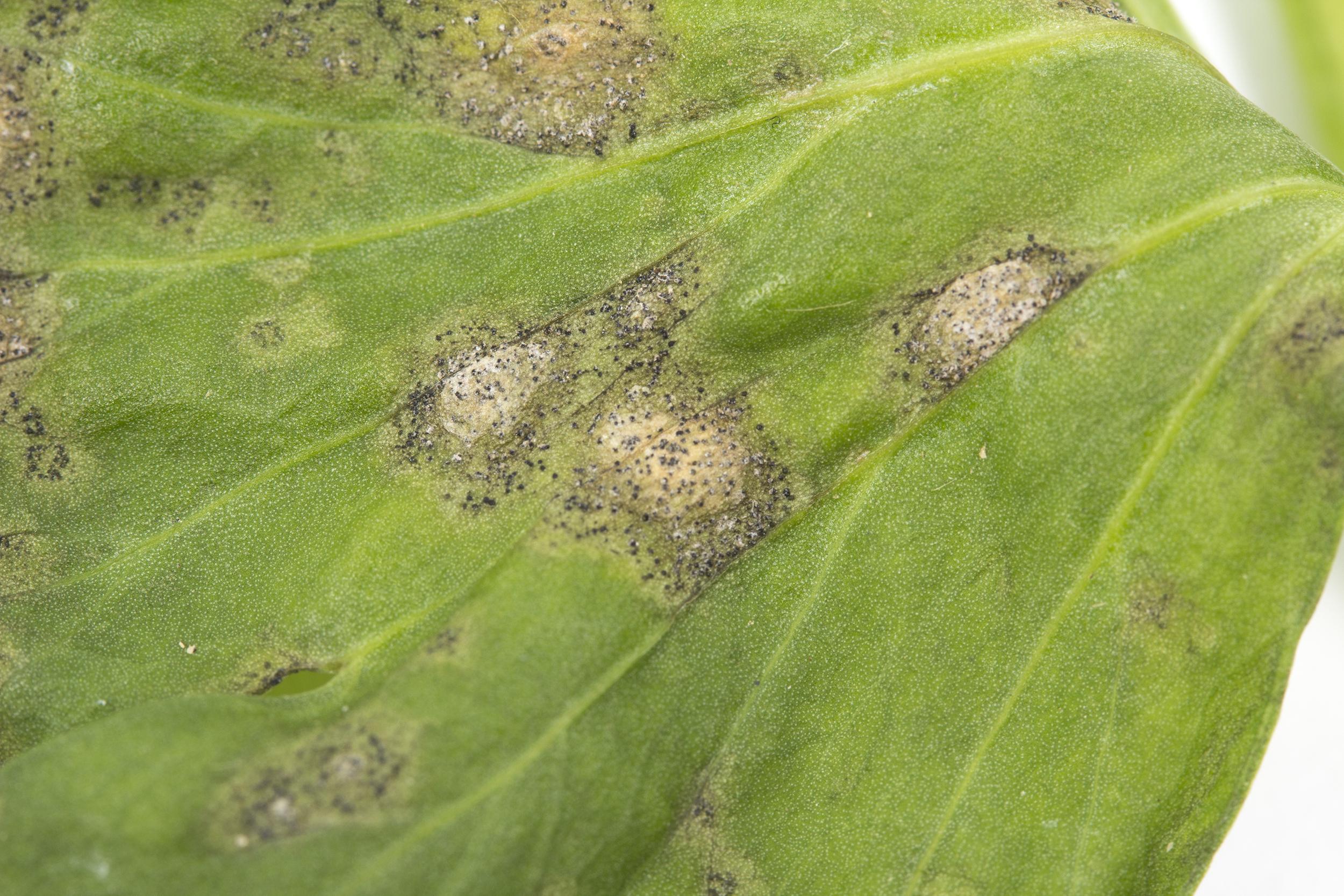 Description: Présence de taches brunâtres entourées d’un halo jaune sur la face supérieure d’une feuille de céleri. Le centre des taches est parsemé de petits points noirs qui correspondent aux pycnides de Septoria apiicola, responsable de la tache septorienne du céleri.