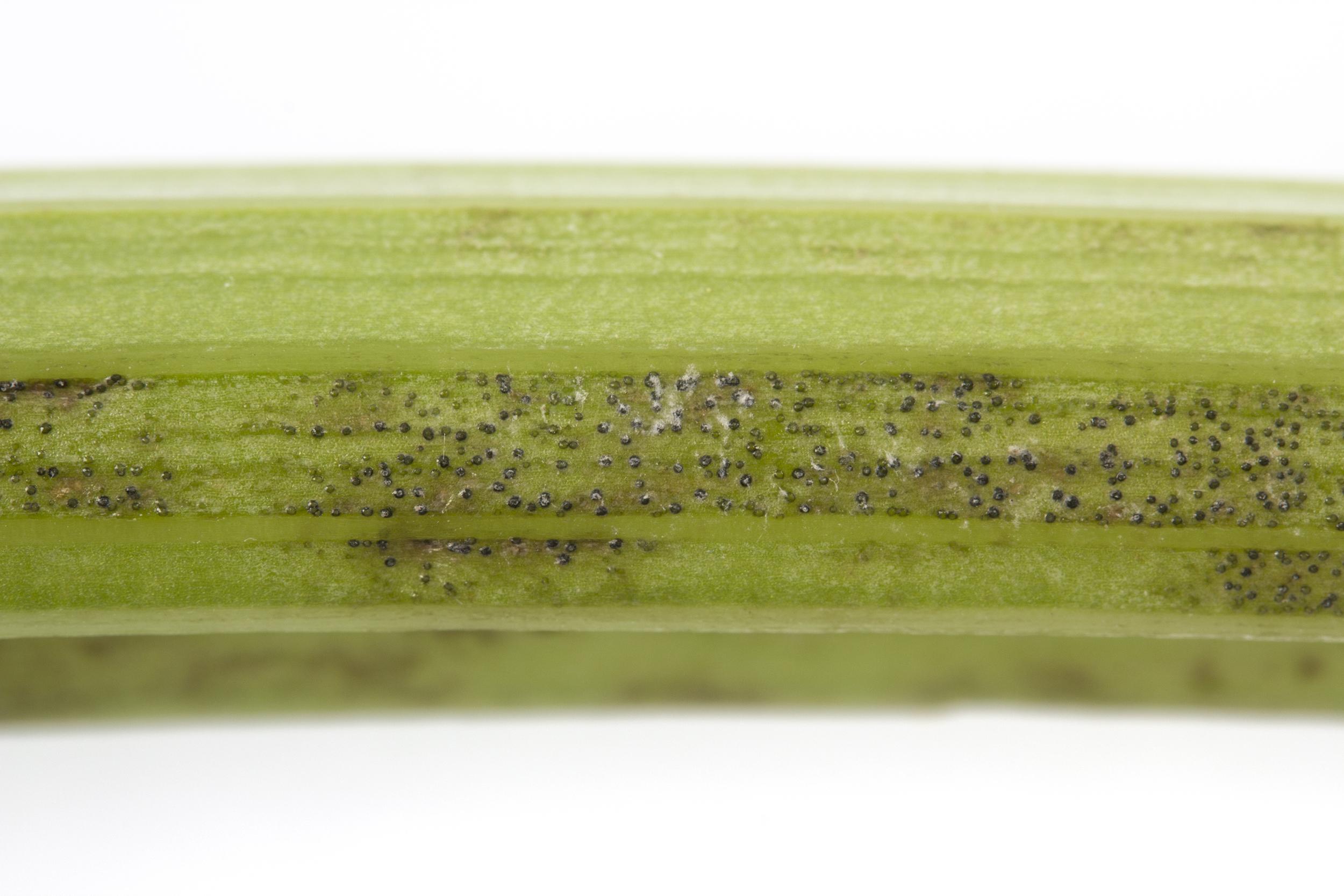 : Pycnides de Septoria apiicola, responsable de la tache septorienne du céleri, regroupées sur le pétiole d'un céleri.