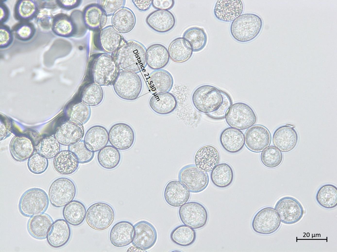 Description: Sporanges de Albugo candida, sphériques à ovales, subhyalin, vacuolés, de 15 à 20 μm de diamètre. Observés sur une feuille de navet infectée par la rouille blanche.