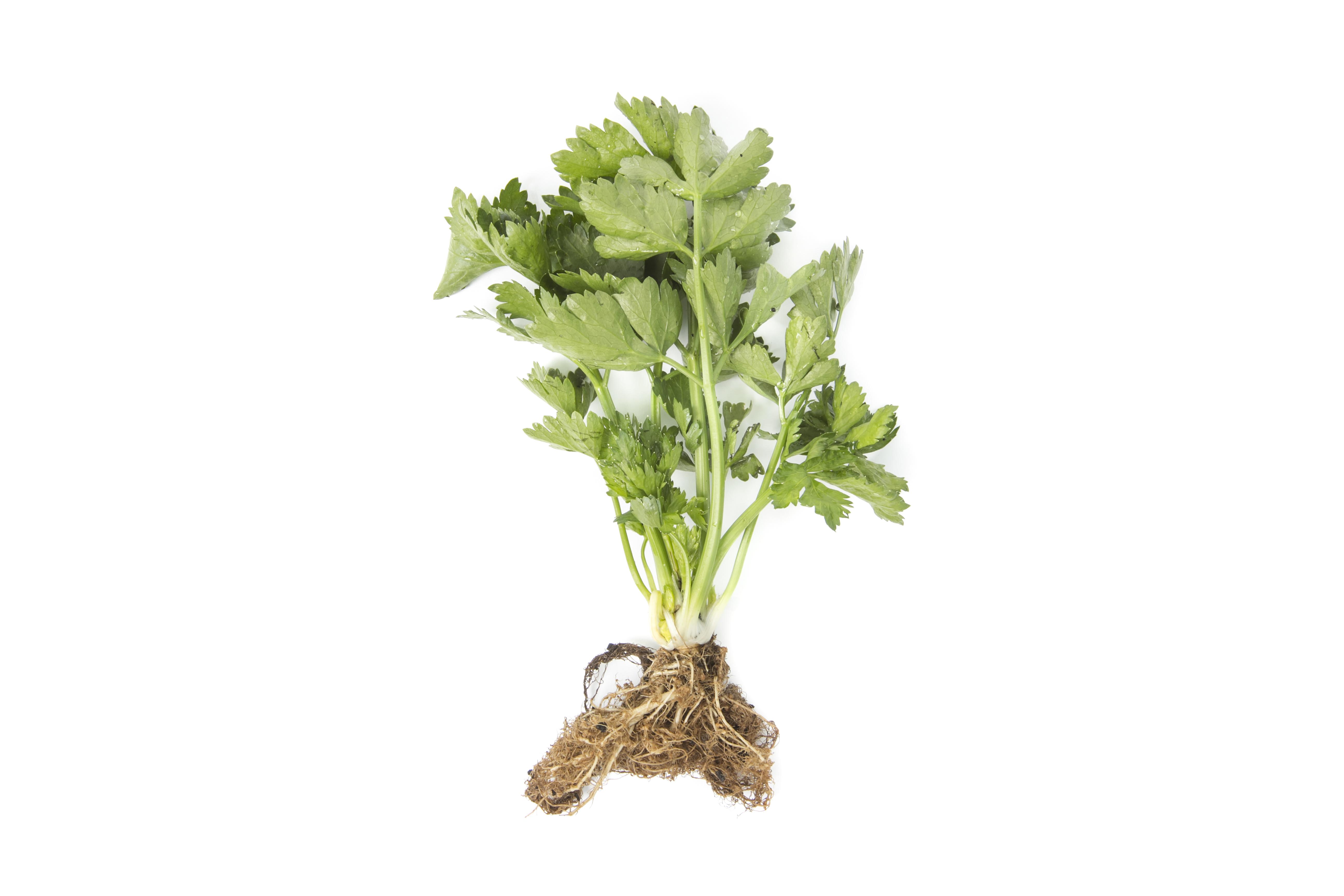 Description: Un plant de céleri montre un jaunissement localisé de certaines feuilles basales. Les racines portent de multiples petits renflements beiges (peu visible ici). Les observations microscopiques ont révélé la présence du nématode Meloidogyne sp. Il s’agit probablement de M. hapla. Ce nématode est responsable de la nodosité des racines. Les plants sont cultivés dans un sol organique.