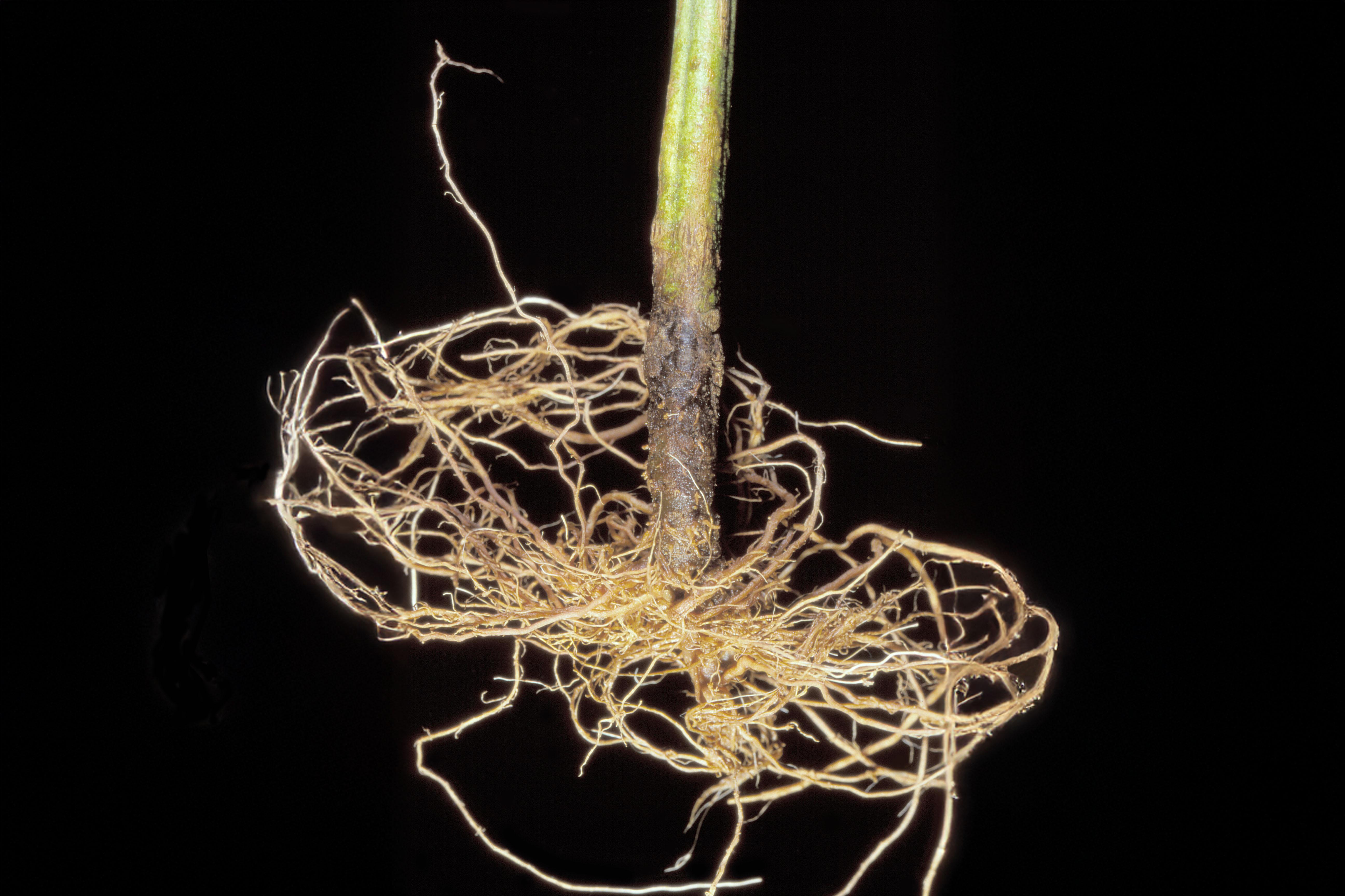 Description: La partie basale d’un plant de tomate de serre montre un chancre brun foncé au collet. Les racines sont également brunes. Les tests de laboratoire ont révélé la présence du champignon Rhizoctonia solani, responsable du rhizoctone commun chez la tomate.